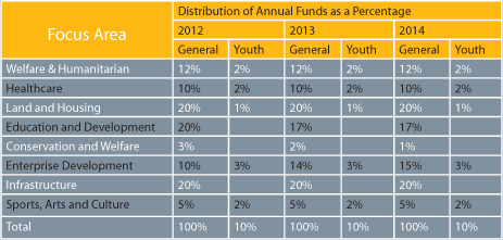 The Focus Areas are similar to those of SIOC-cdt for ease of coordination. Generally, more than one Focus Area ends up contributing to a project's activities as the implementation may, e.g., ECD under Education & Development may require infrastructure, hence the involvement of Infrastructure Focus Area. The table below shows the distribution of funding resources by the Focus Area for the period covered by the Short-Term Strategy.